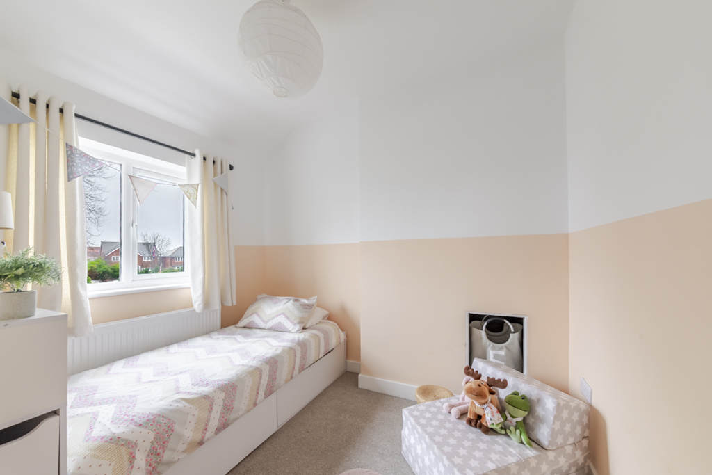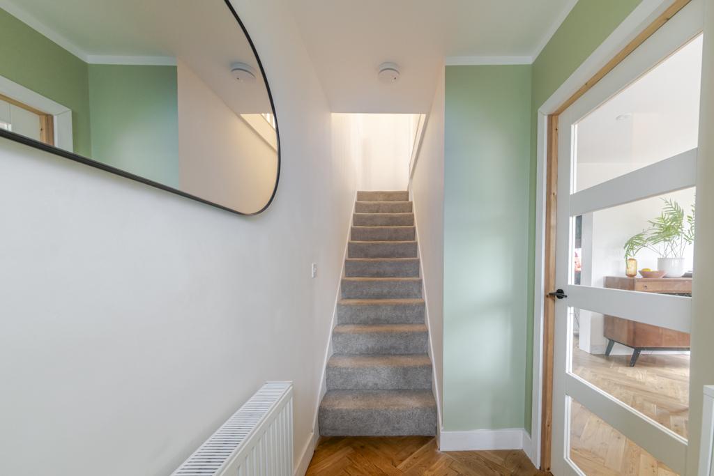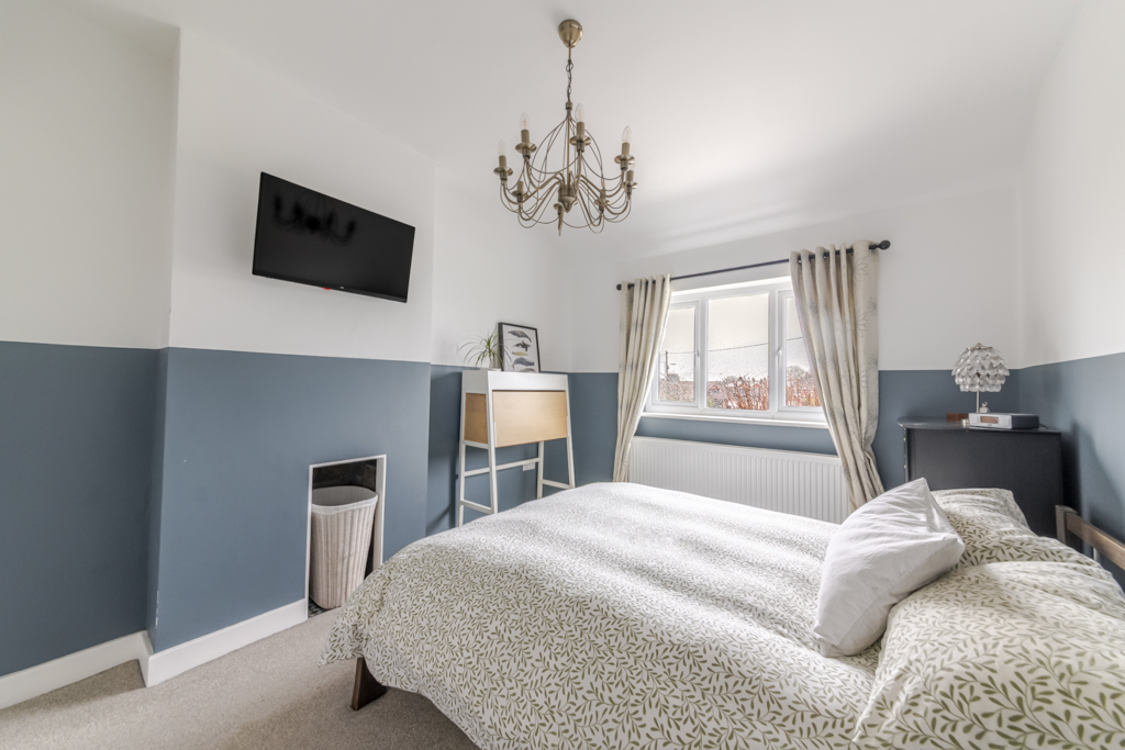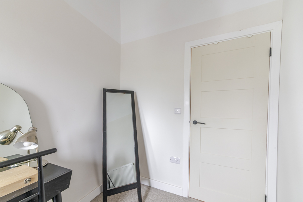 To the first floor, the bathroom is a standout feature, fitted with both a bath and a generously sized walk in shower. There are three bedrooms, including a spacious and bright principal bedroom, a comfortable second bedroom and a third bedroom which benefits from high ceilings and an exposed beam, adding character and charm.