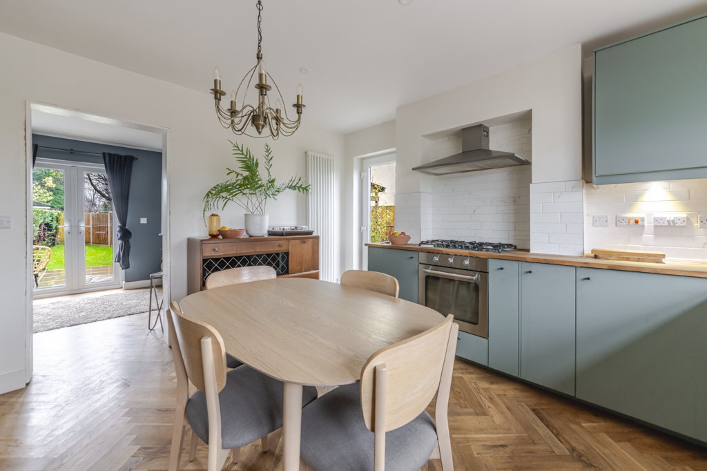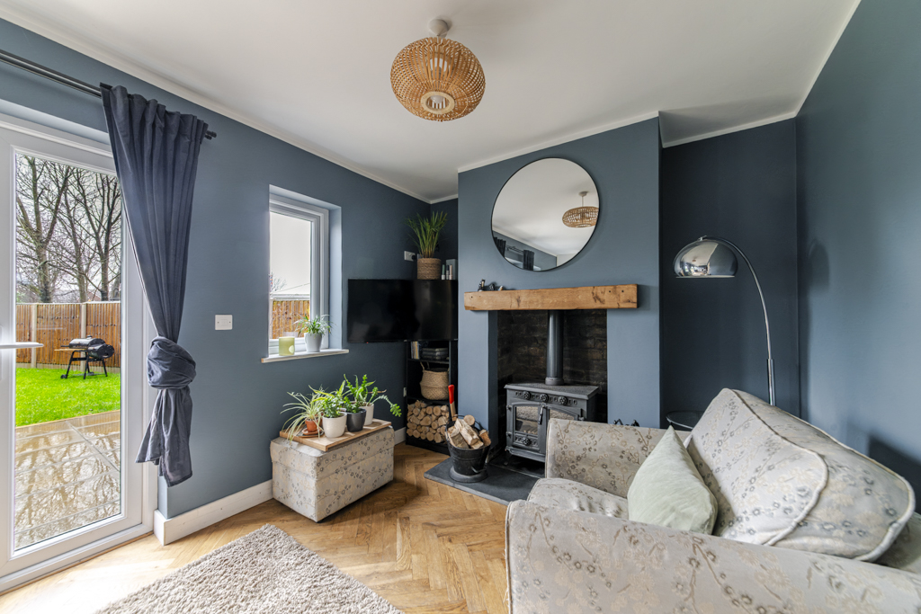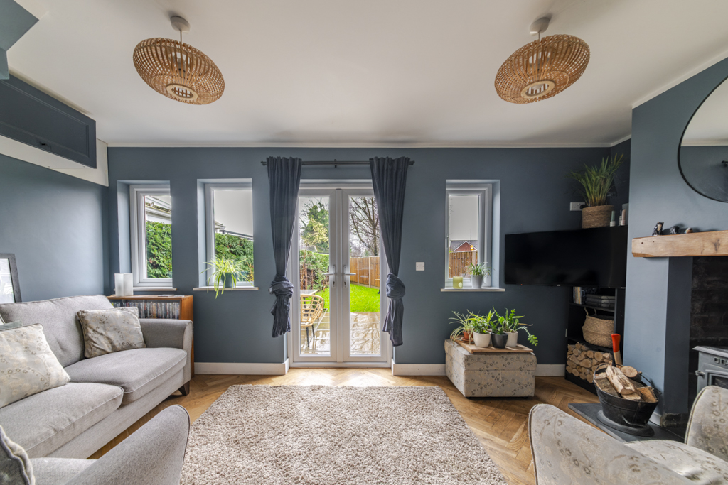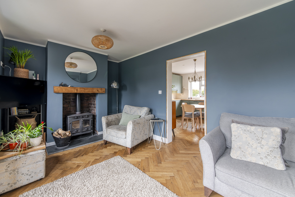 On entering the property, the kitchen is positioned to the front and has been renovated to a good standard, offering a modern and functional space with direct access to the rear garden. To the rear of the property is a comfortable living room, featuring a cosy fireplace and enjoying views out to the garden, making it an ideal space to relax. Herringbone flooring runs throughout the downstairs, adding a stylish and cohesive finish to the ground floor.