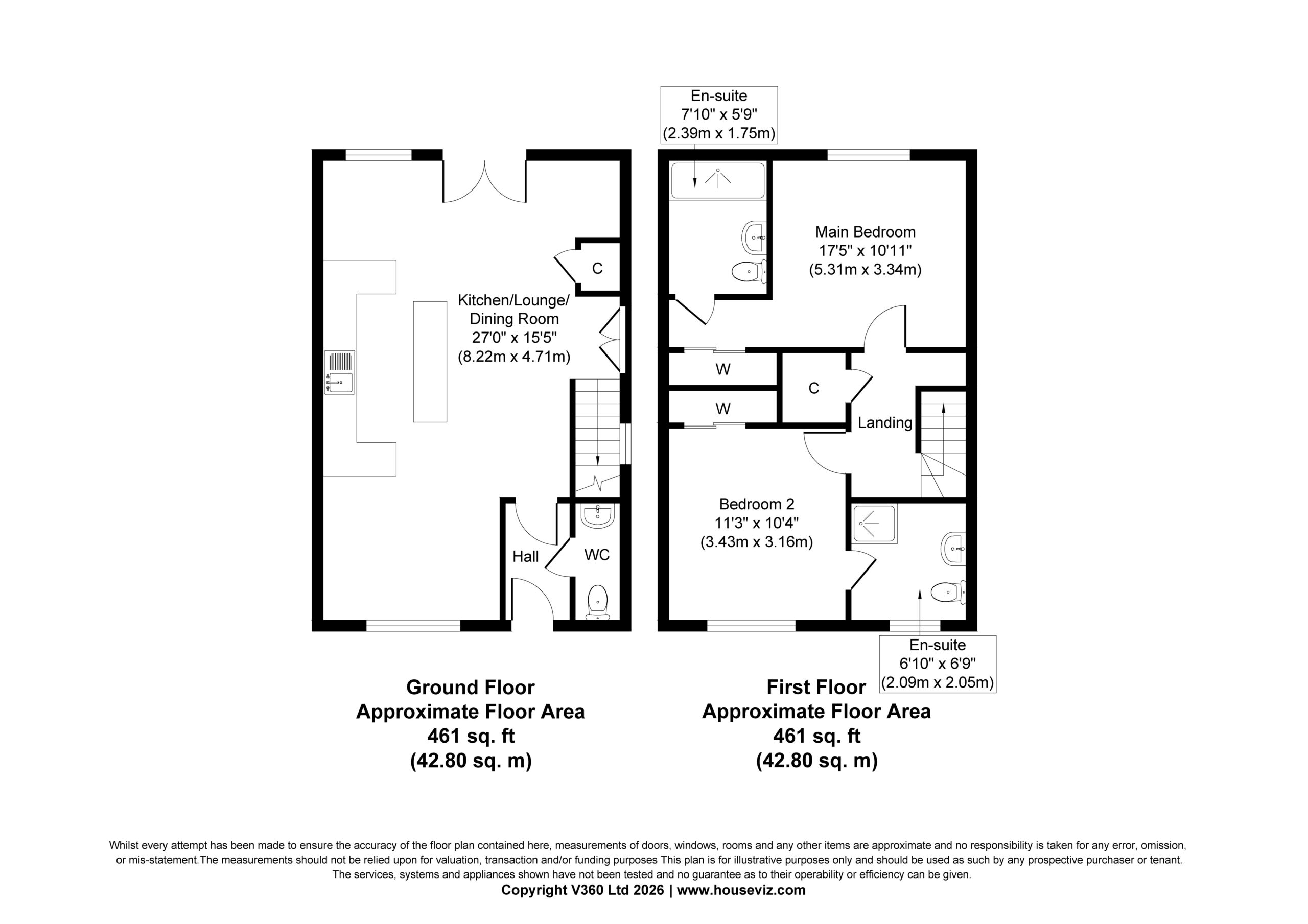To the first floor are two generous double bedrooms, both featuring fitted wardrobes and their own en suite shower rooms, offering a high level of comfort and privacy.
