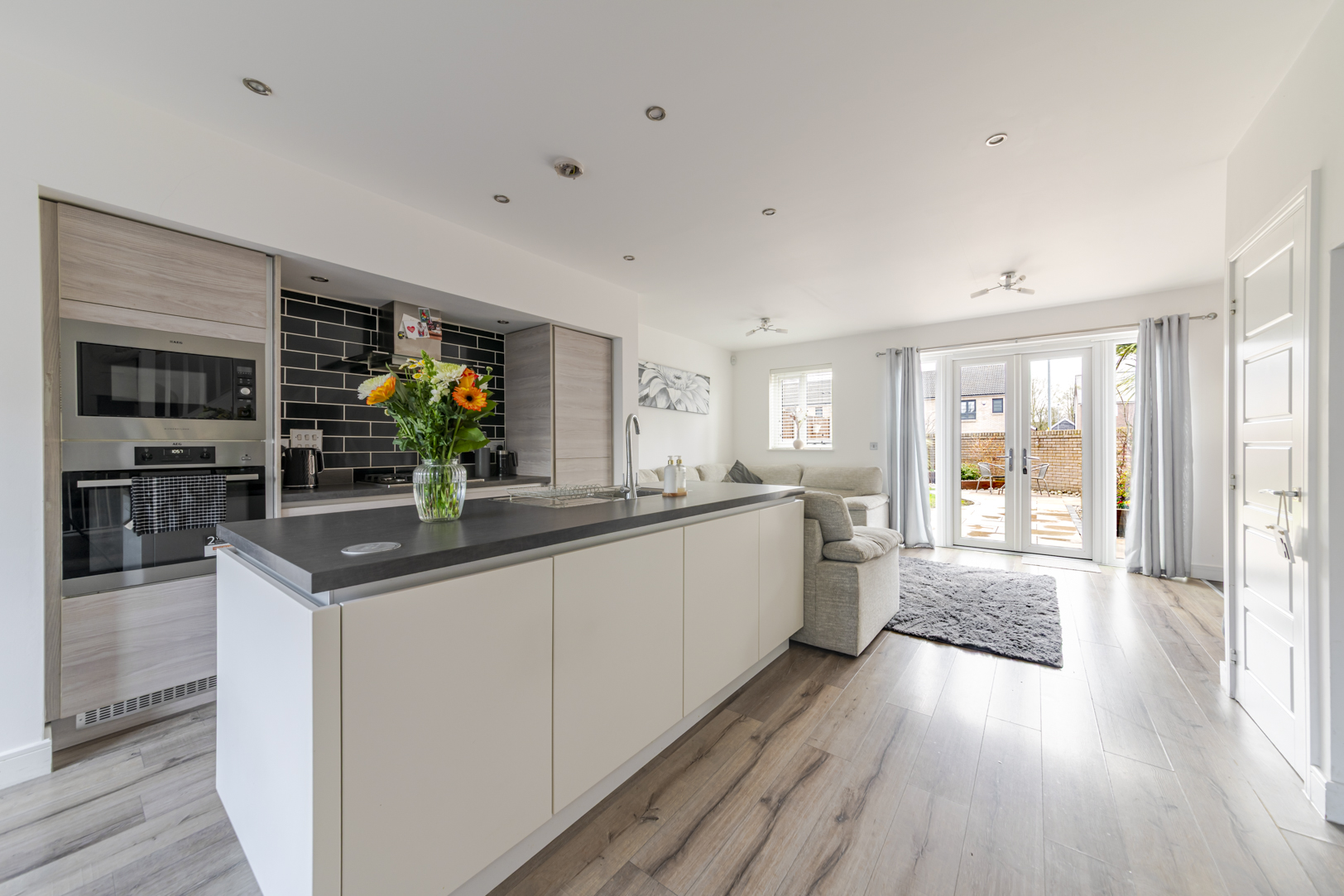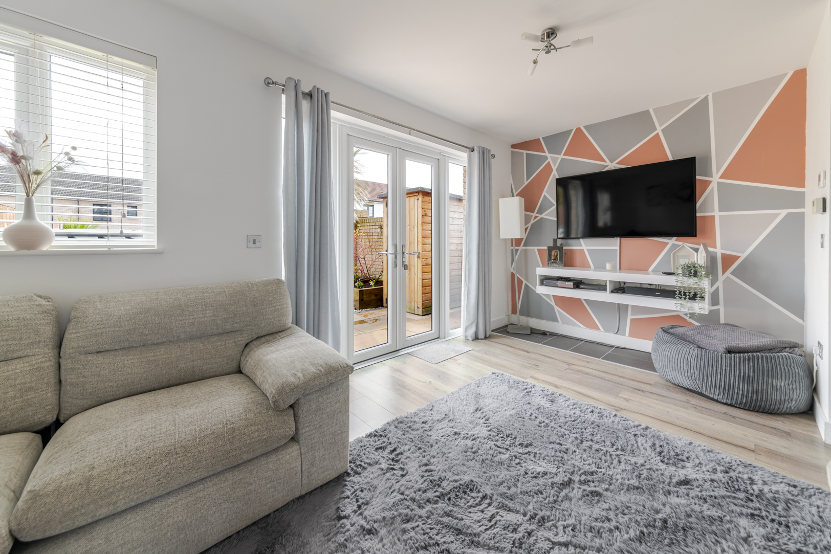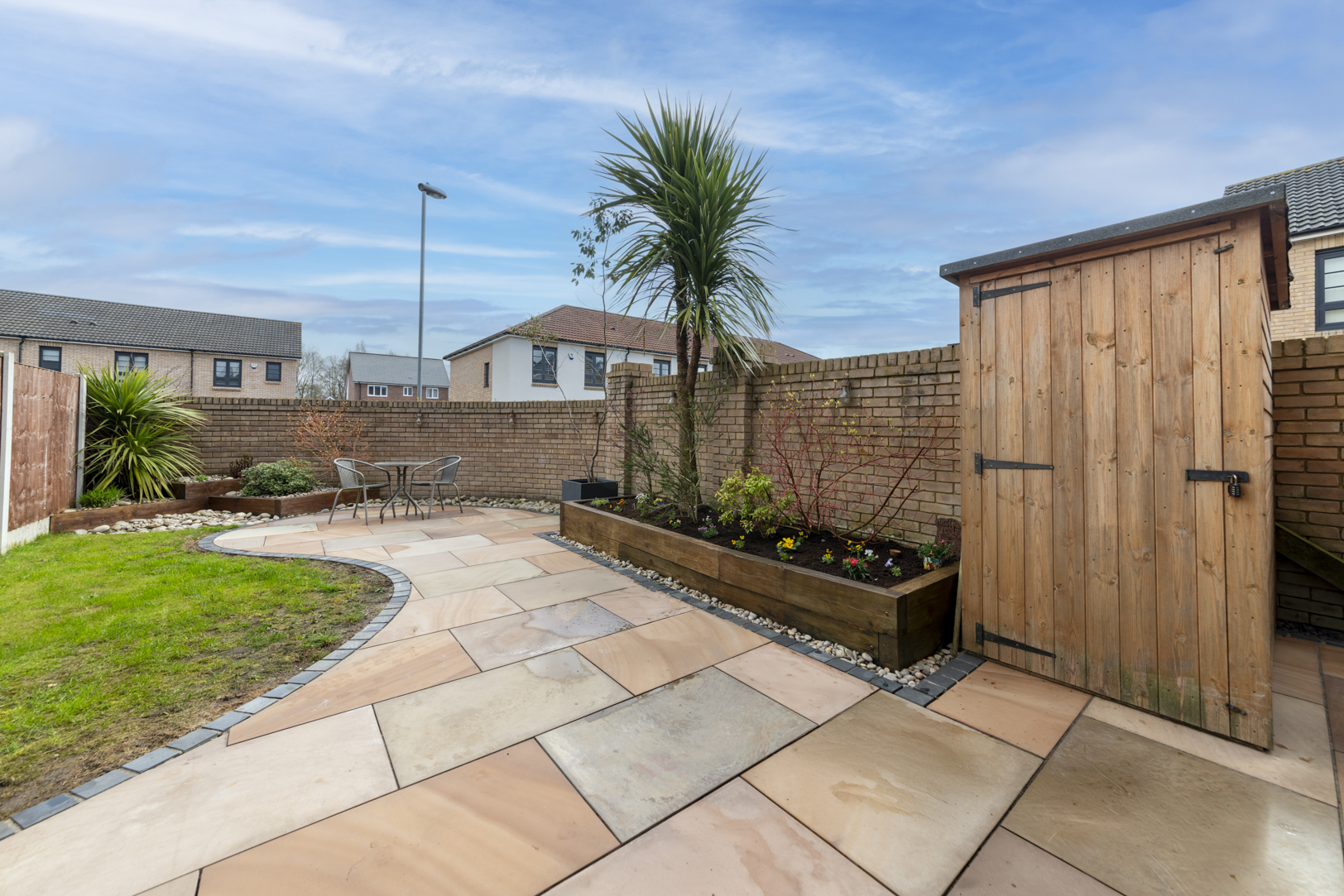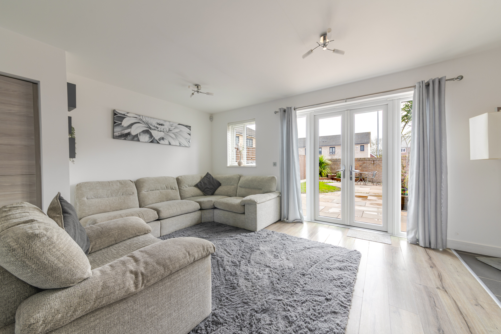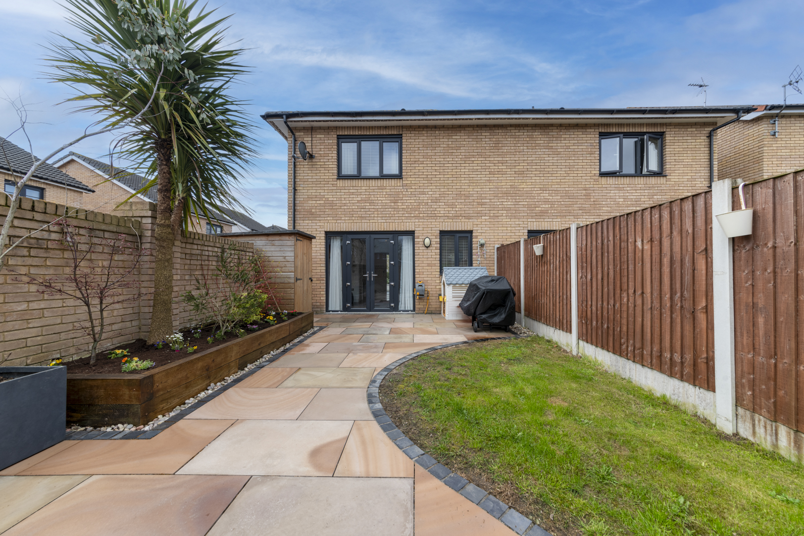 Patio doors open from the living area onto the landscaped rear garden, creating a seamless connection between indoor and outdoor space. The garden has been designed for ease of maintenance while still providing a pleasant area for seating and entertaining.