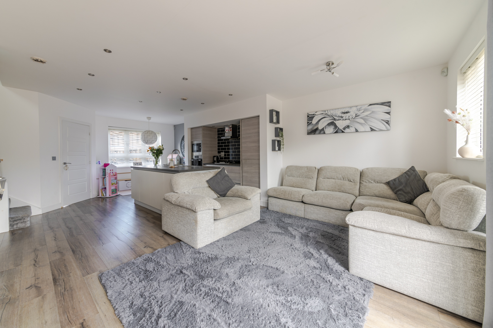 Internally, the home is thoughtfully designed with a contemporary open plan layout. The ground floor comprises a welcoming entrance hallway with a useful downstairs WC, leading through to a spacious living, dining and kitchen area. This impressive open plan space is both practical and versatile, featuring a central island with integrated appliances and ample storage. There is plenty of room for both dining and relaxation, with the current layout offering flexibility to suit a variety of lifestyles.