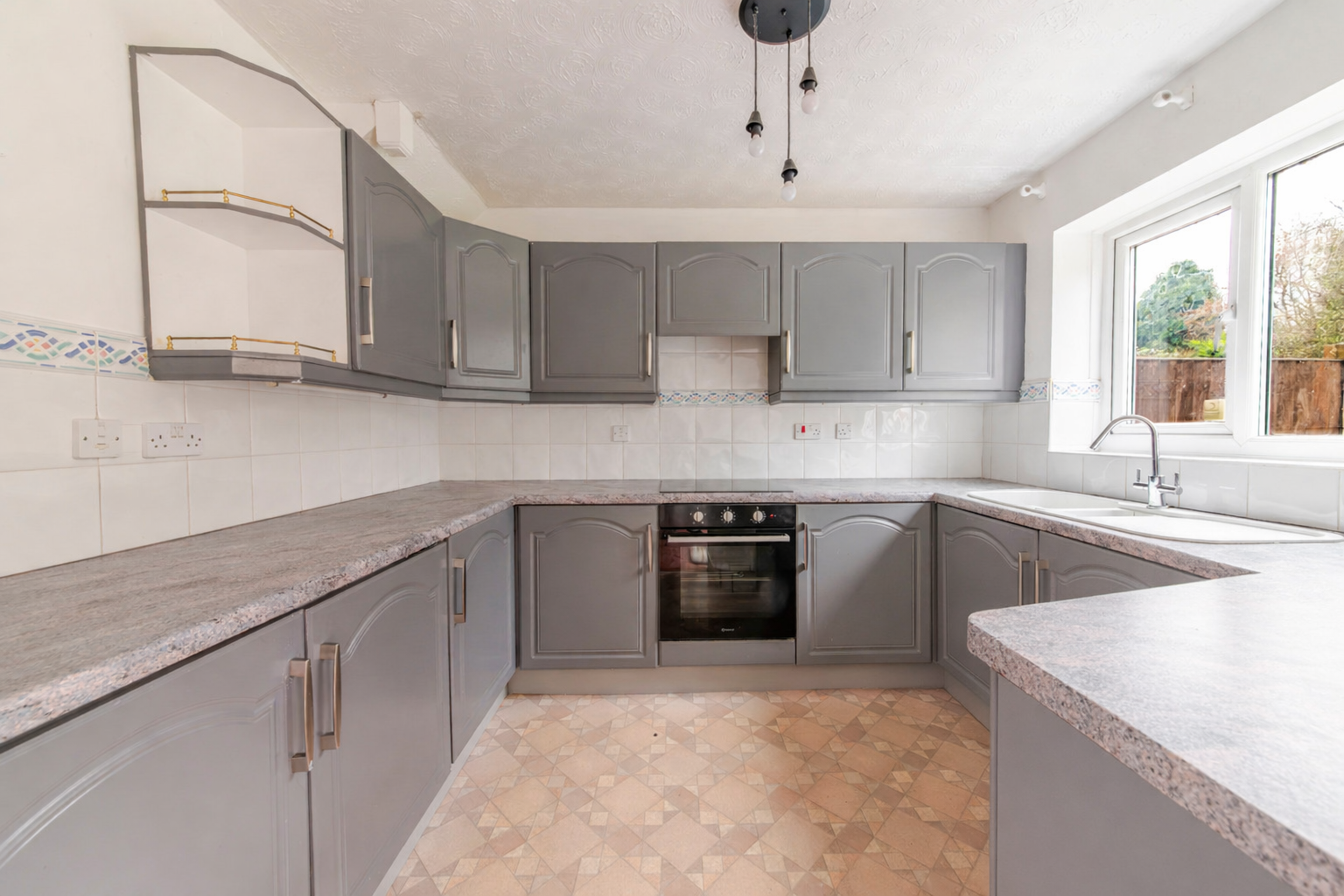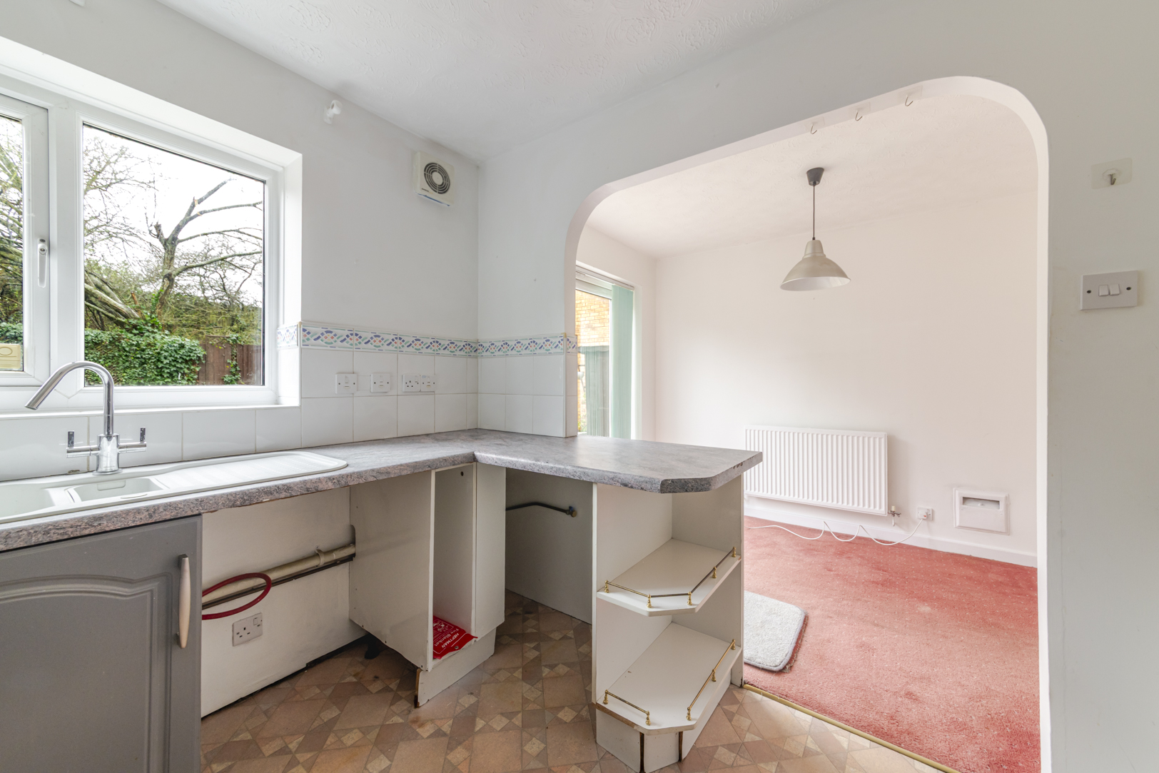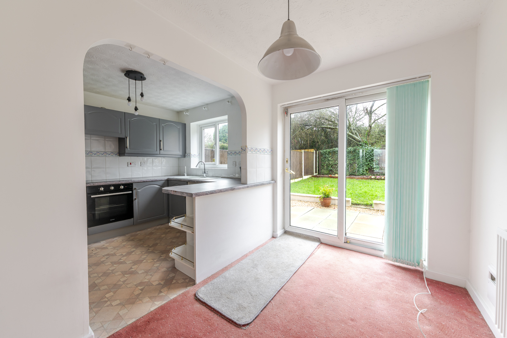 Internally, the property opens into a welcoming living room, a comfortable space with further potential to enhance. To the rear is a kitchen dining room offering a practical layout, complete with an integrated oven, hob, fridge and freezer. The space also features bi-fold doors that open directly onto the garden, creating a lovely connection between indoor and outdoor living while allowing plenty of natural light to flow through.