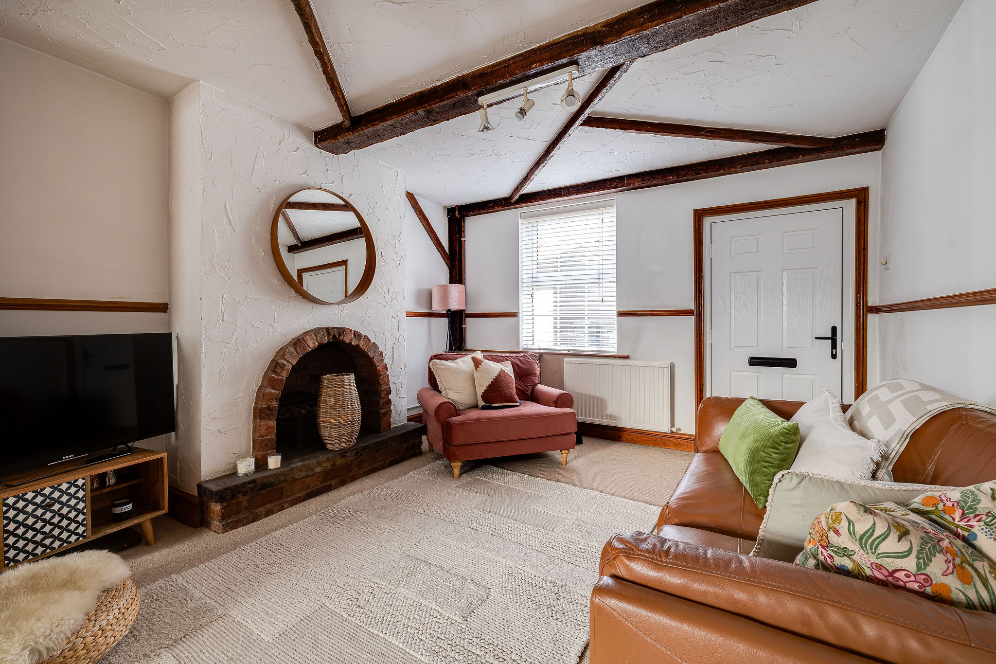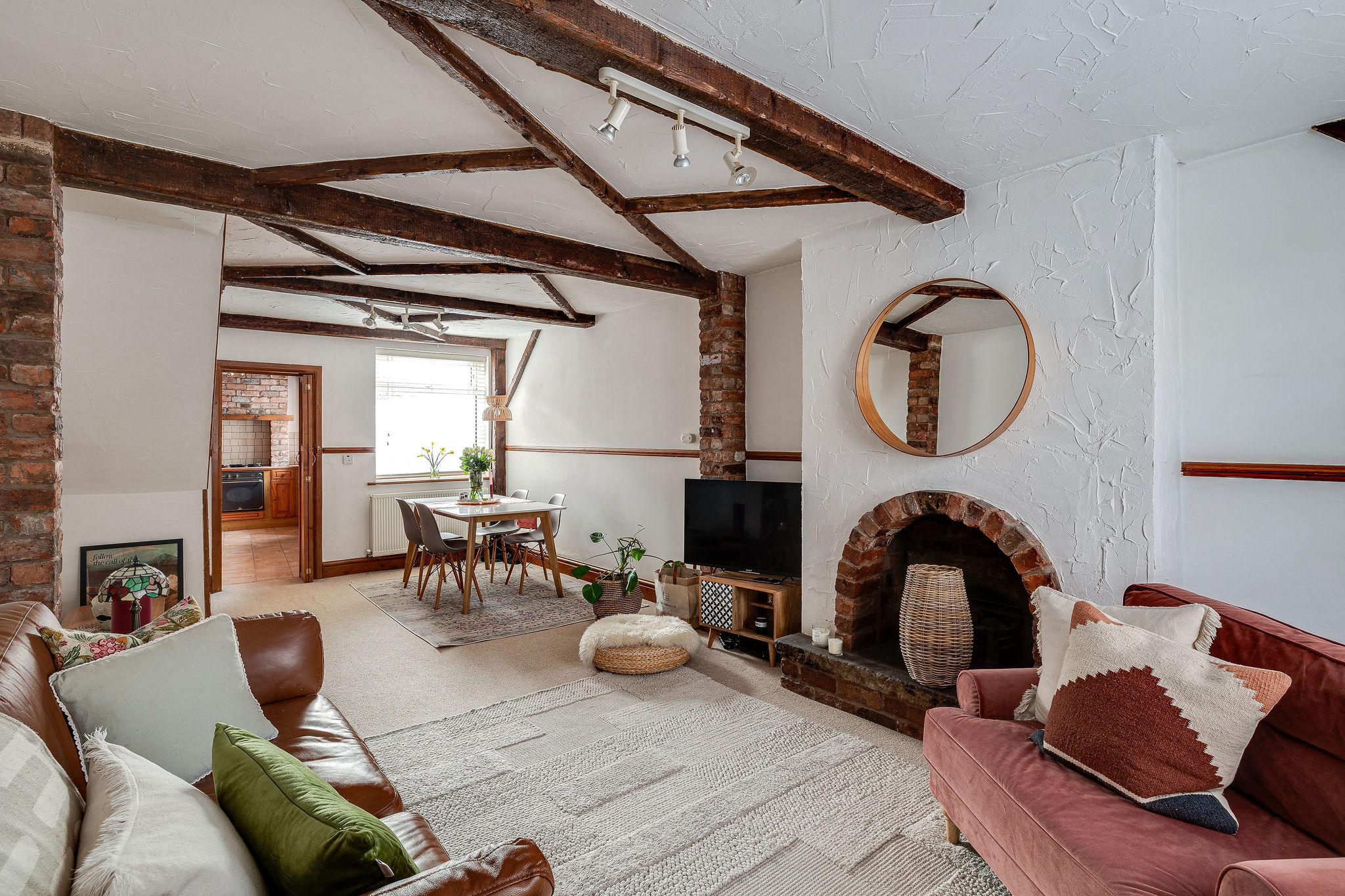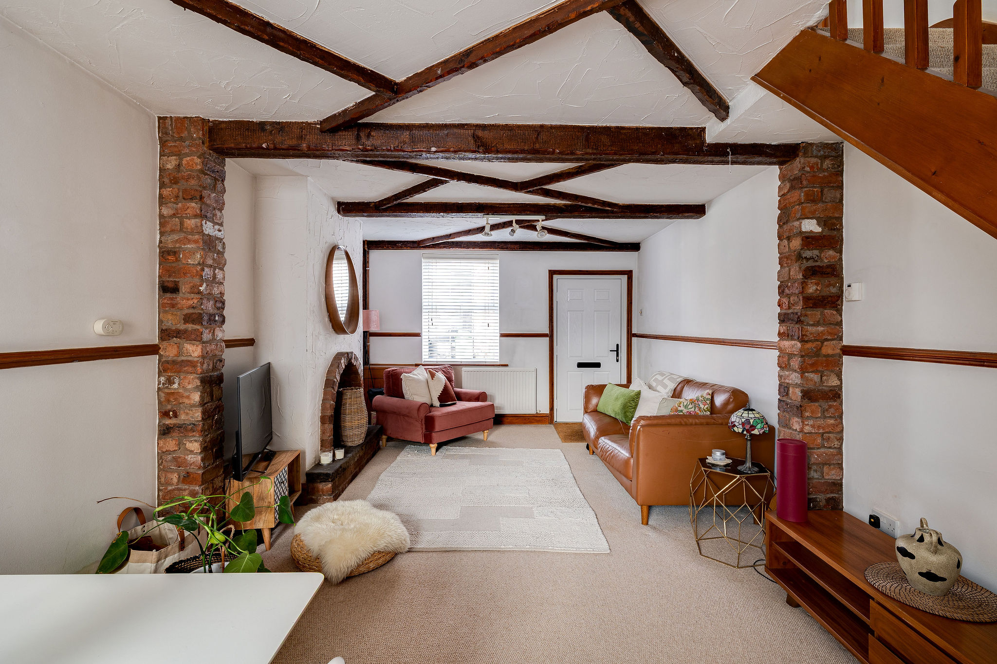 - Endearing home with charming cross beams across the ceiling of the large living room.